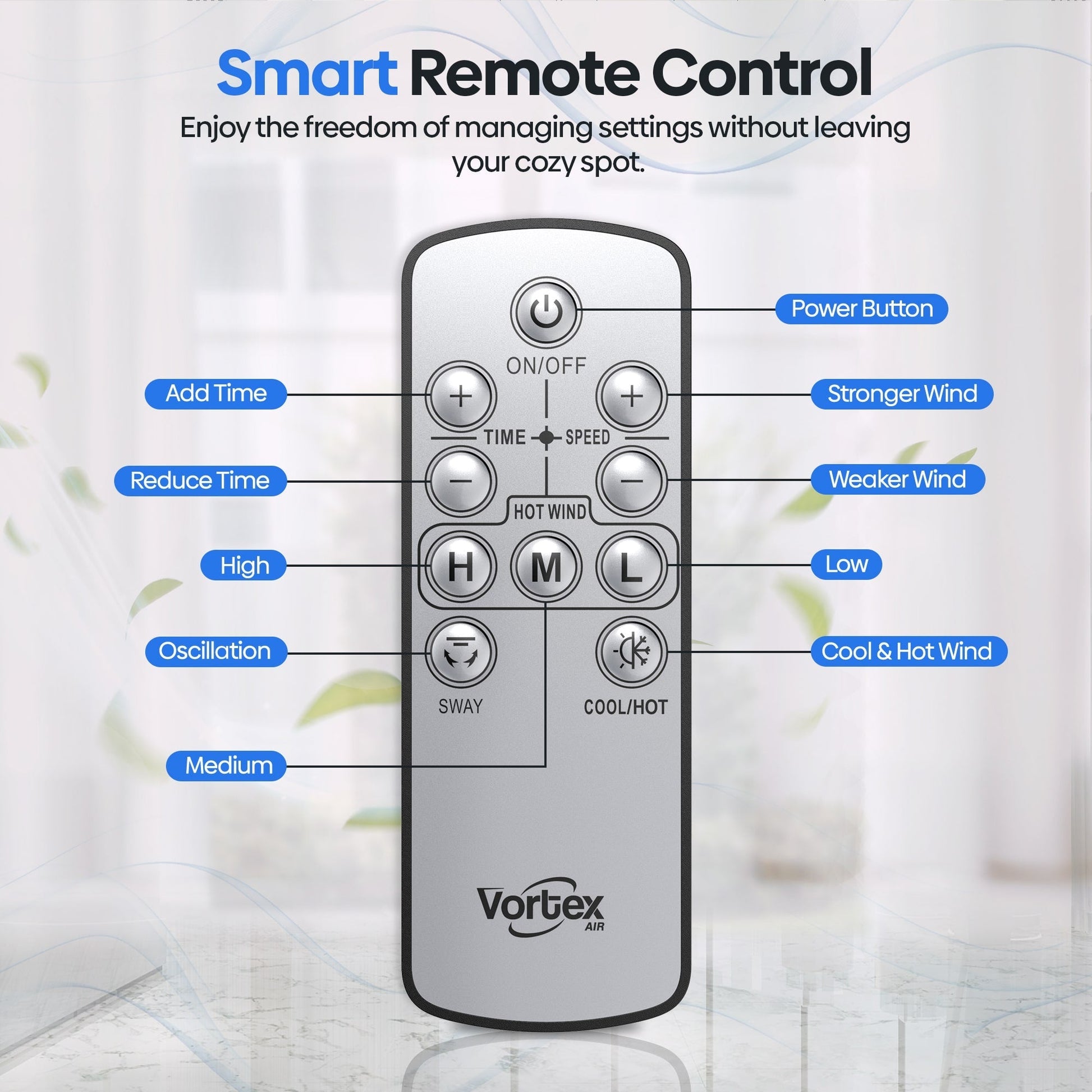 Bladeless Fan Hot + Cool Heating & cooling modes to combat any climate. Energy efficient to reduce household bills. Stunning bladeless design, offers an aesthetic look. Up to 35 degrees heat. Warm your room in minutes. Designed for family safety. No sharp edges or blades. Oscillating & a more flexible rotation head than Dyson. 10 Fan speed settings to adjust wind intensity. Timing function. Set a timer between 1-9 hours. 9 hours continuous use. Reliable & durable design. LCD touch control. Smart operation for ease of use. Smart remote control. Risk free. Whole Room Heating + Cooling Our technology produces high velocity airflow, projecting a stream of smooth air to suit your chosen climate. Long range personal heating or fast even room heating. Safety In Mind No fast spinning blades. No visible heating elements. No burning smell. It Automatically shuts off when tipped over. Room Cooling High velocity room cooling when you need it during those hot summer months. Built in smart thermostat maintains room temperature to avoid wasted energy. Low Noise Now up to 60% quieter. Perfect for cooling your room before bed or whilst you sleep. No more unpleasant choppy air. Now you can enjoy powerful, uninterrupted & smooth airflow. Timing Function Programmed to turn off after preset intervals. Ranging from 1 to 9 hours. Robust & Reliable Heats the room evenly, with no cold spots continuously for 9 hours. Powerful Personal Cooling During warmer weather you can enjoy powerful personal cooling.